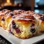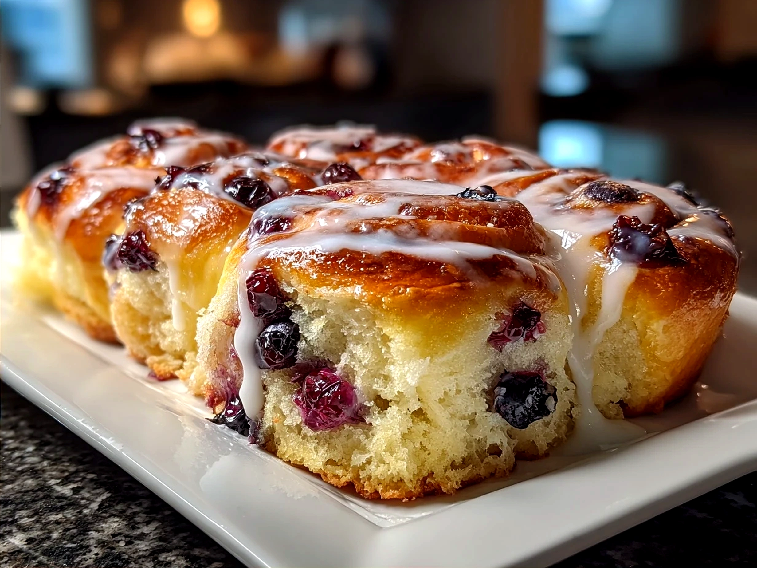 Close-up of freshly baked Blueberry Lemon Sourdough Sweet Rolls served warm