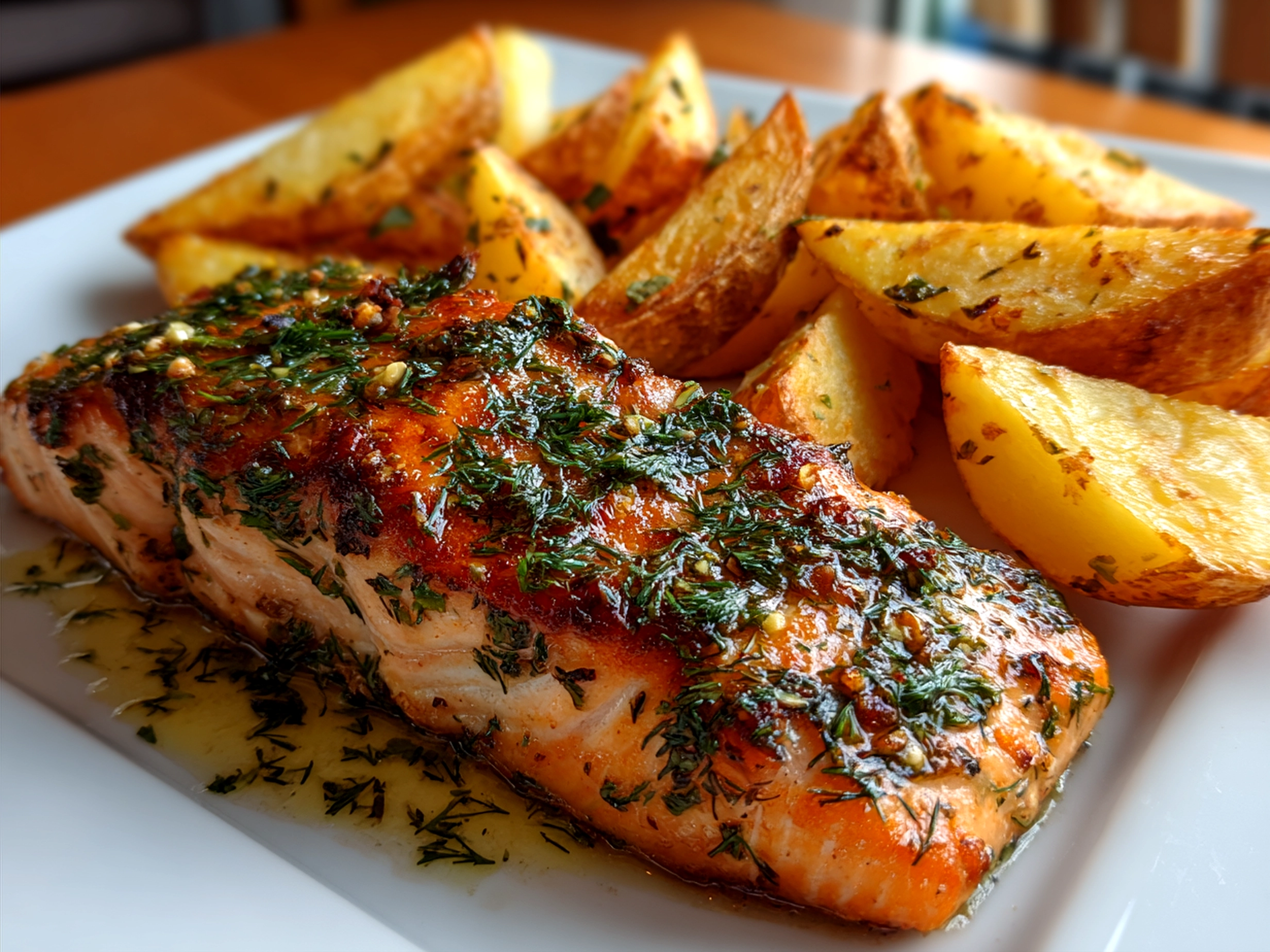 Served Dill Salmon with Potato Wedges and Creamy Pickle Dill Sauce on a plate