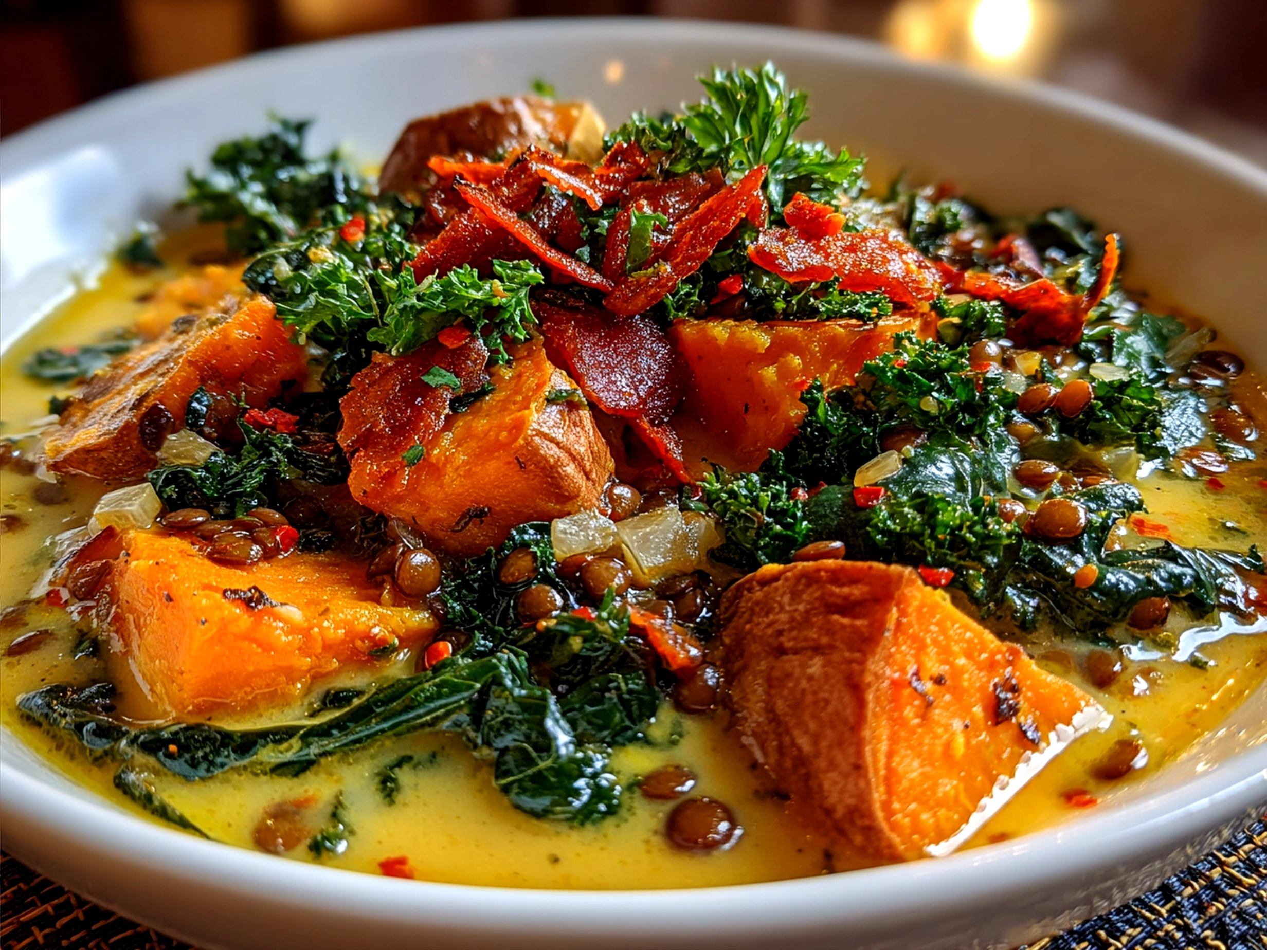 A comforting and hearty stew featuring sweet potatoes, creamy coconut milk, lentils, and nutrient-rich kale, infused with warming ginger for a flavorful vegan meal.