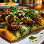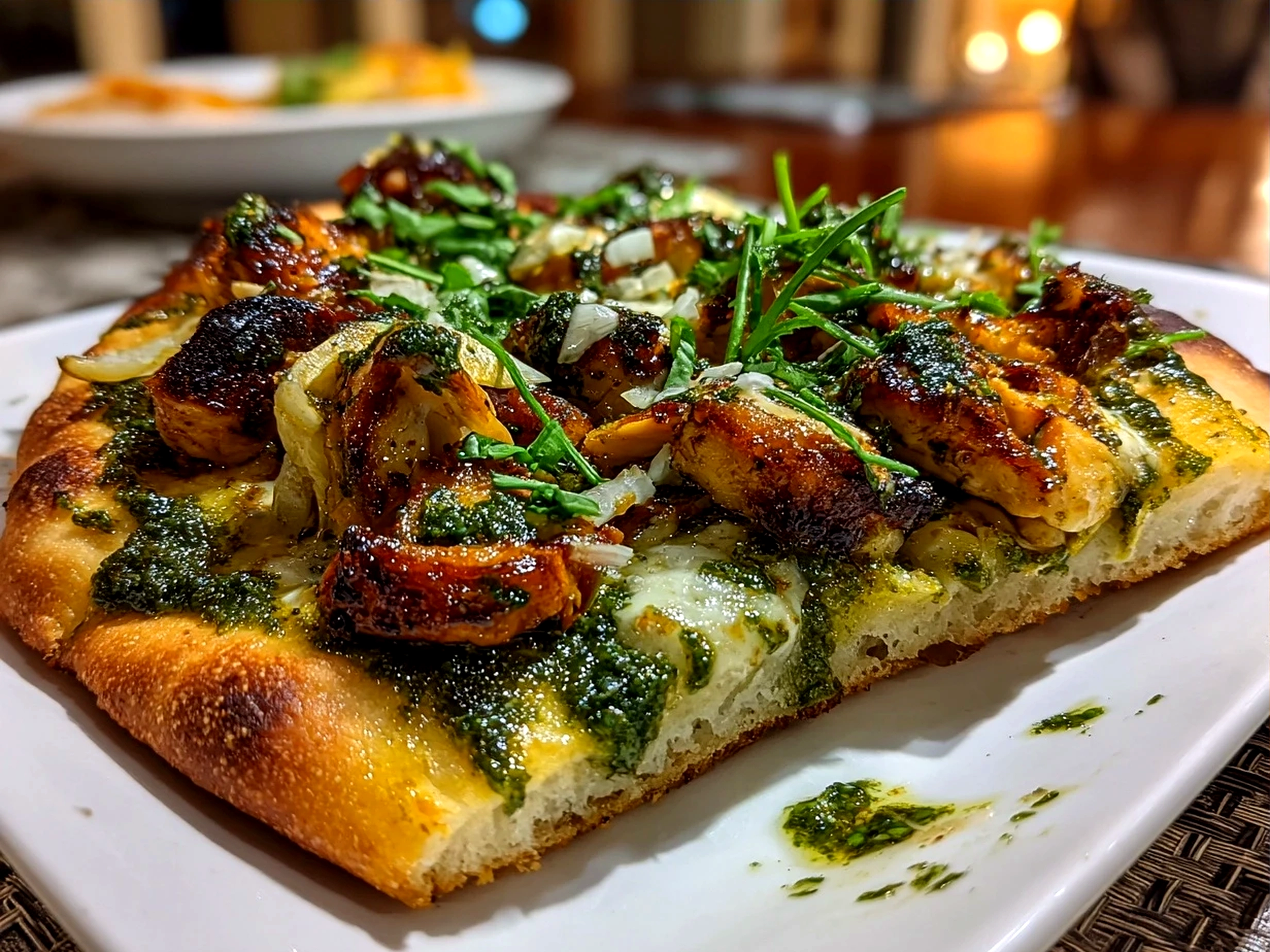 A flavorful and easy-to-make Pesto Chicken Flatbread featuring tender chicken, fresh basil pesto, and melty cheese on a crispy flatbread base. Perfect for a quick dinner or shareable snack.