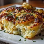 5. While that’s cooking, layer the sliced potatoes and onions inside your baking dish, overlapping slightly for even cooking. Pour the cheesy sauce evenly over the top. This layering is what creates the comforting potato casserole texture and keeps every bite full of flavor.