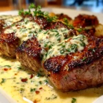 This succulent steak is topped with a rich and velvety garlic cream sauce, perfect for an indulgent dinner that balances robust flavors and smooth textures.